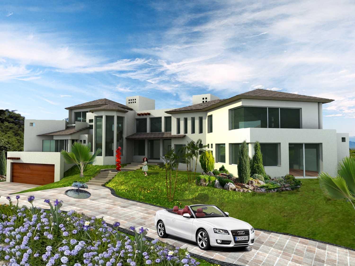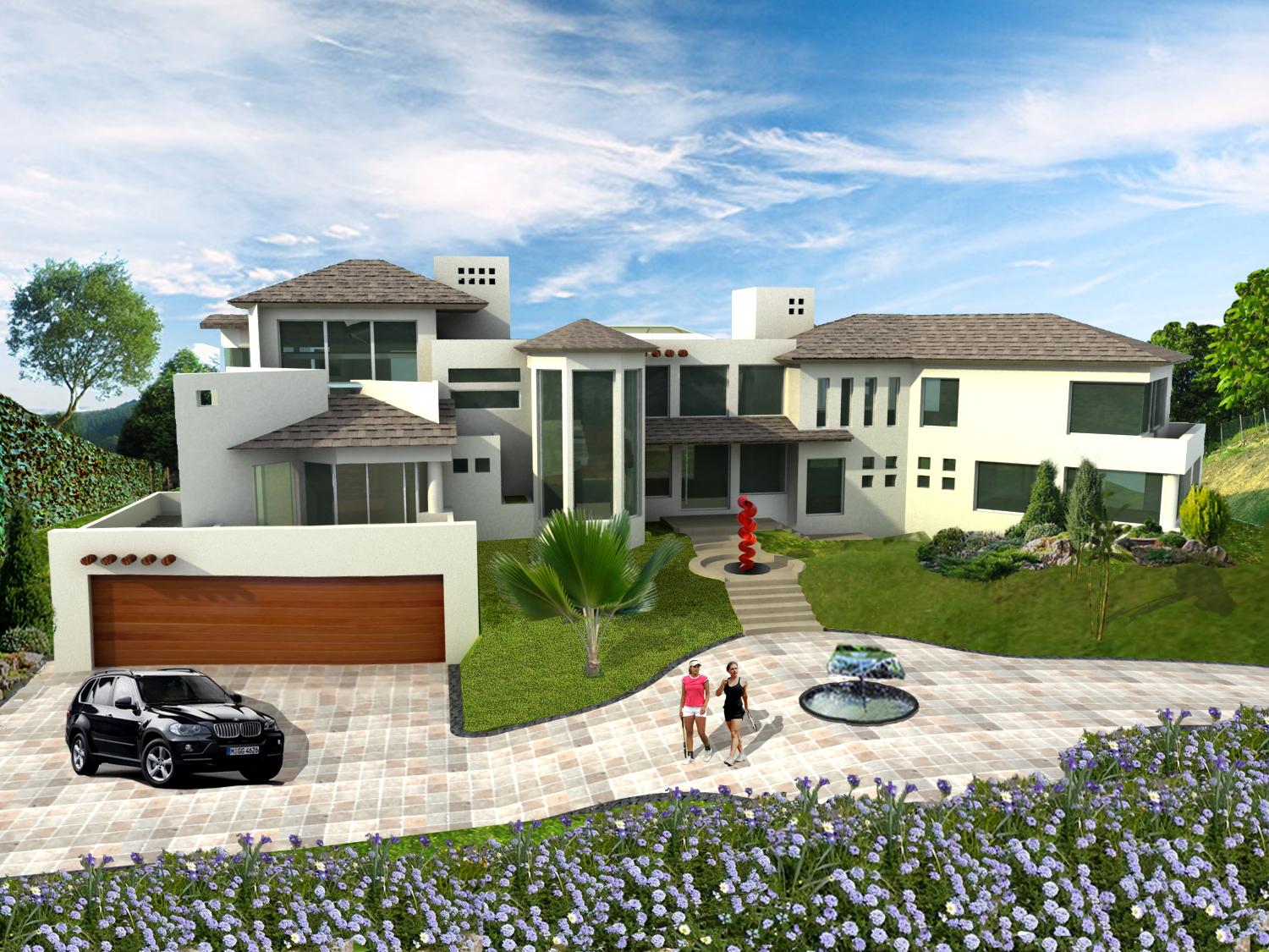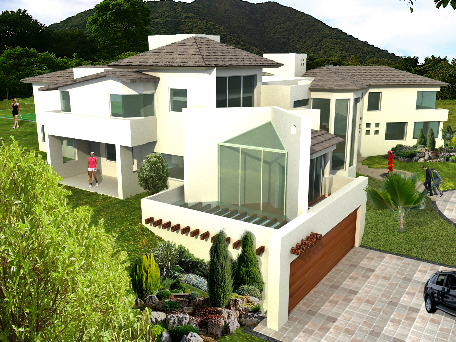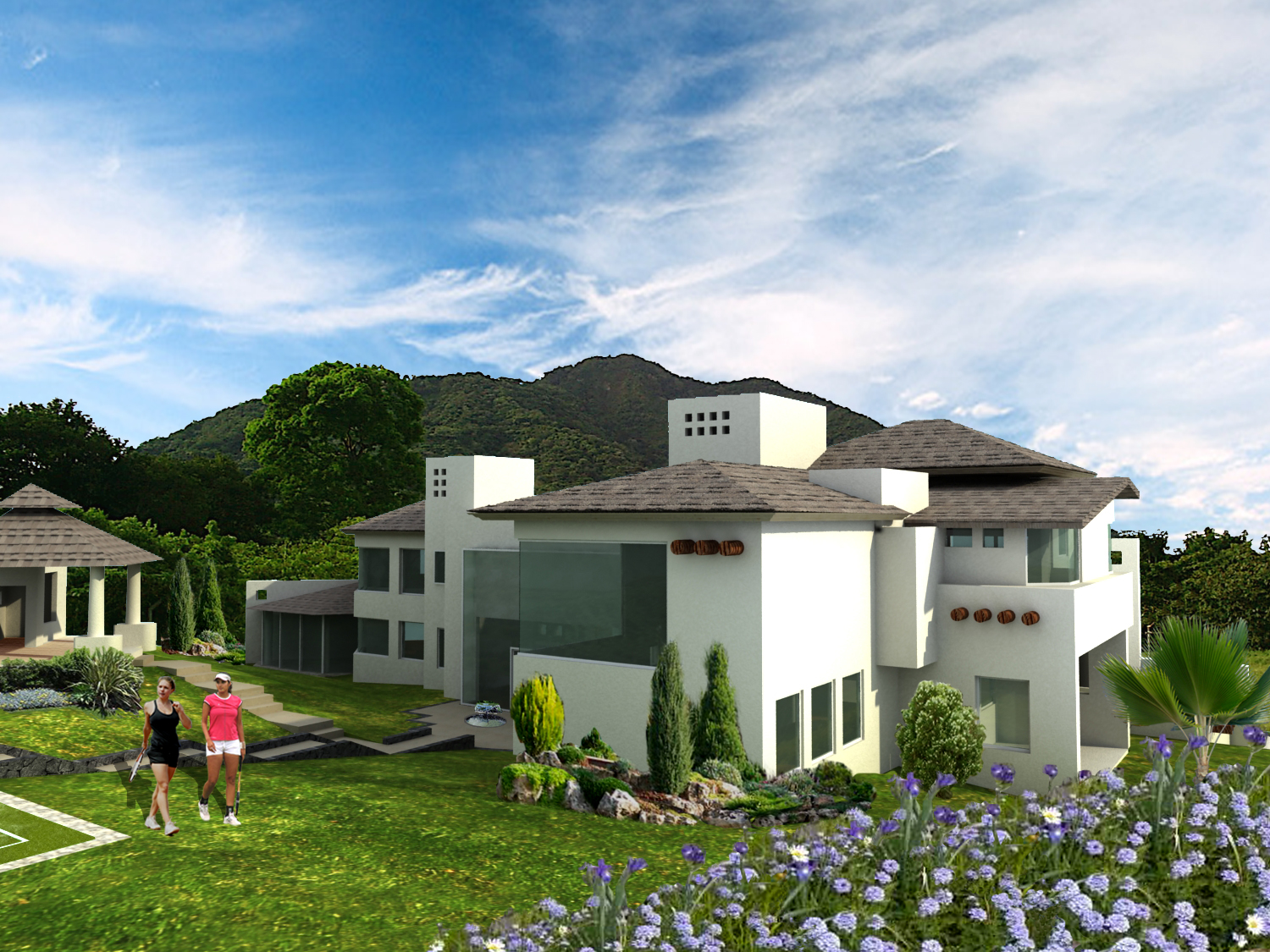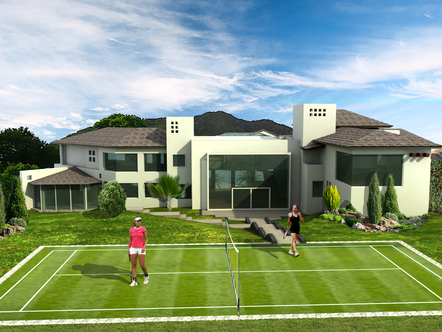 La casa esta solucionada en dos niveles y un sótano para el extenso programa de 6 habitaciones, 2 salas de T.V., salón de juegos, una oficina, piano- bar, amplia estancia–comedor, cocina y desayunador, 2 bodegas de despensas, lavandería y cuartos de servicio. En el exterior la casa está rodeada de un extenso jardín en el cual se encuentra el área recreativa, con una cancha de tenis y una palapa estancia con bar y asador.