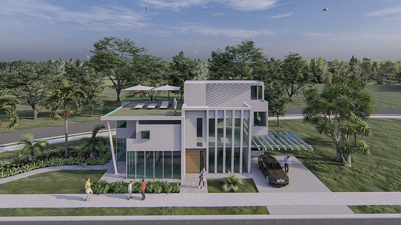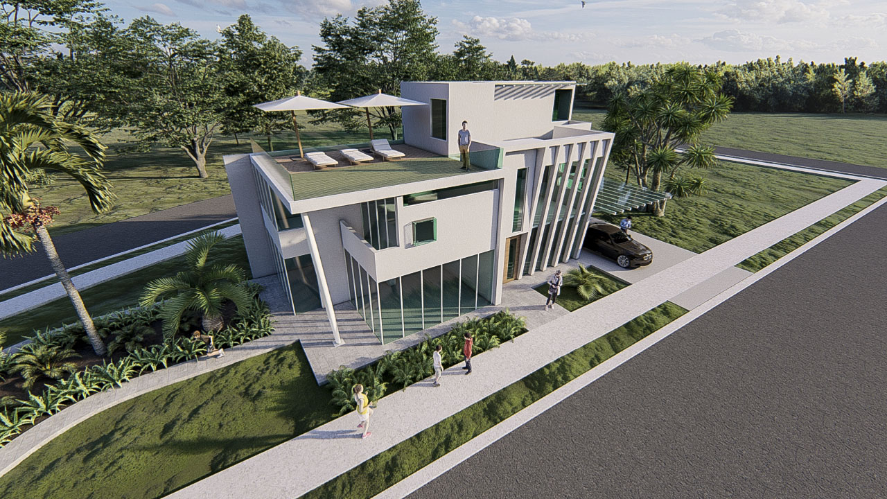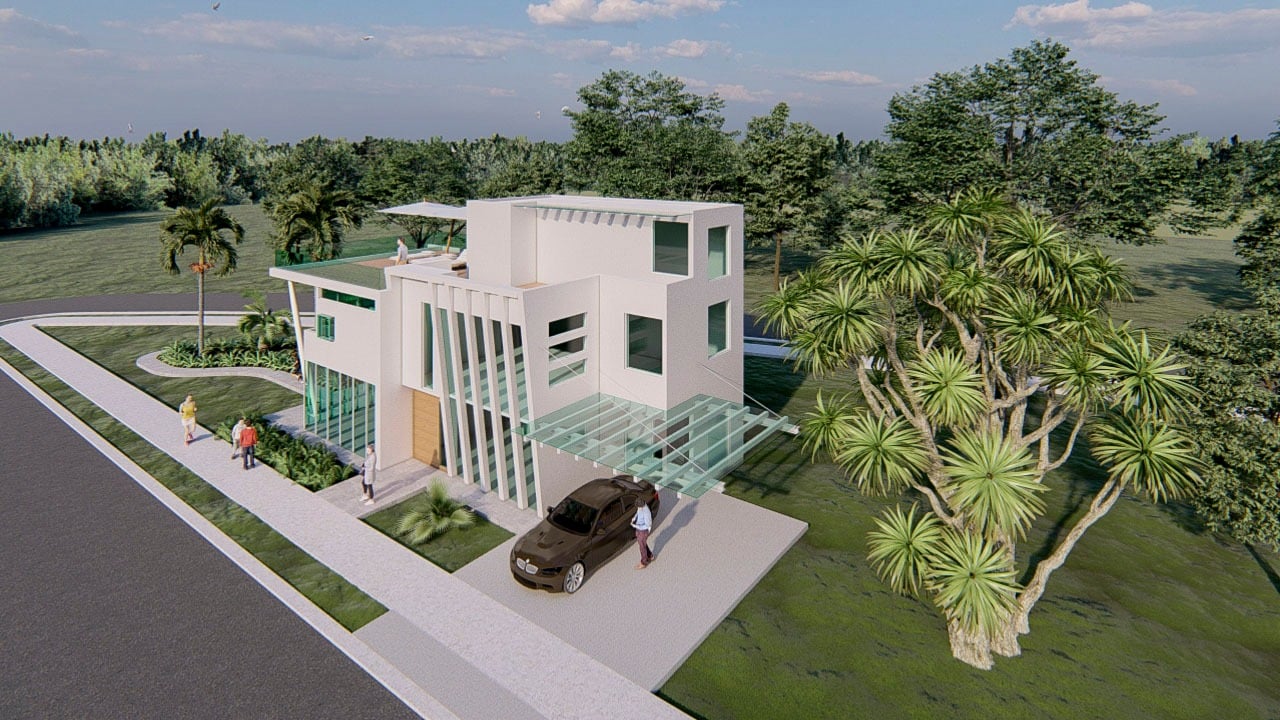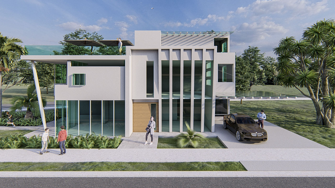 La casa fue concebida en un material homogéneo en su totalidad, en concreto armado blanco con un agregado de grano de mármol blanco, con la intención de tener un contraste visual entre la jardinería y la casa.