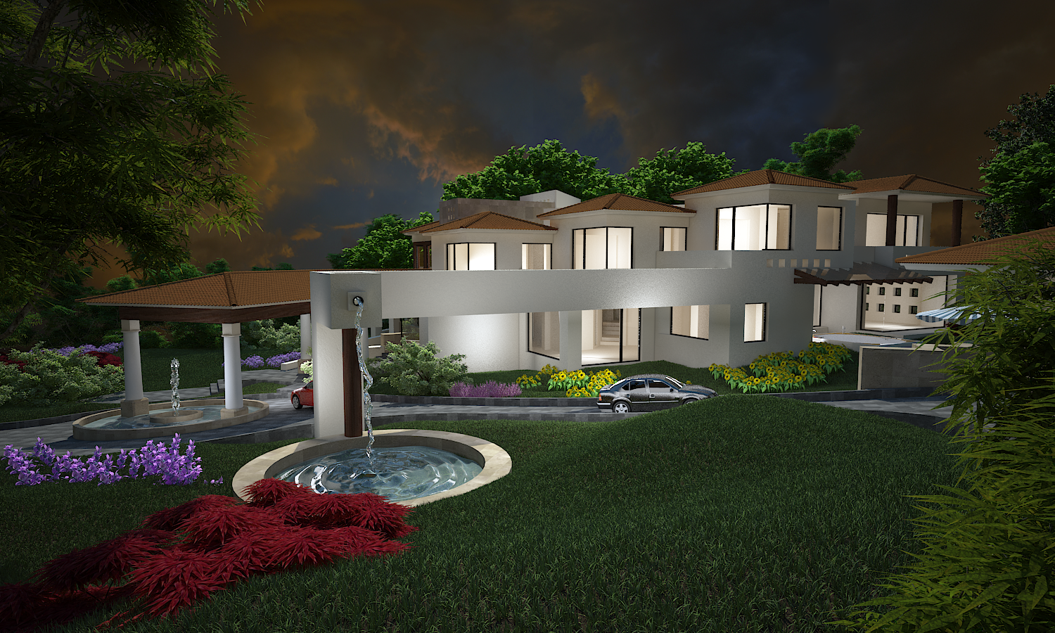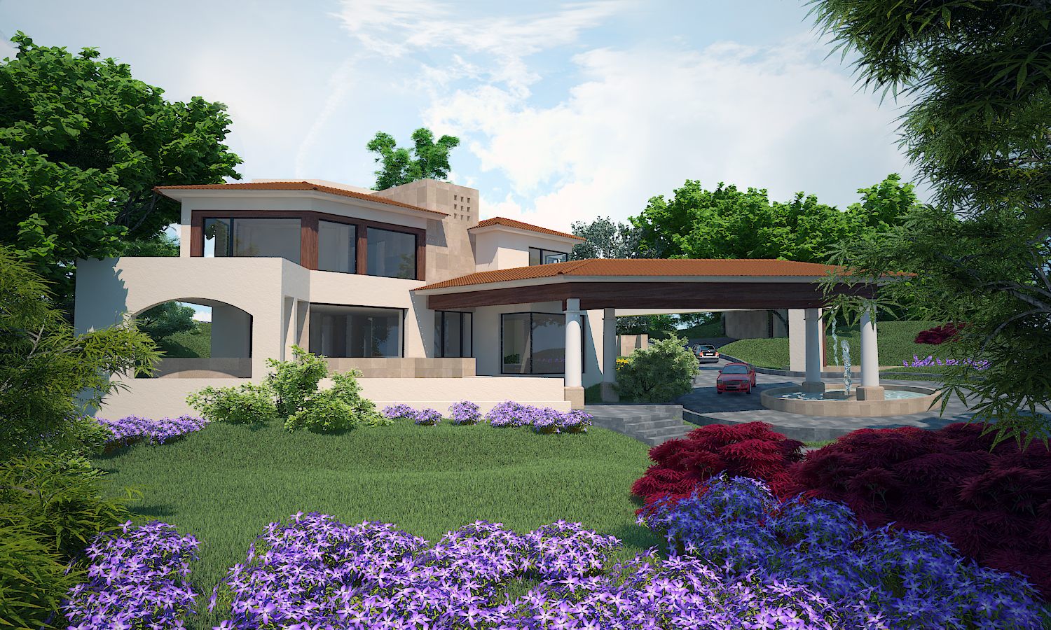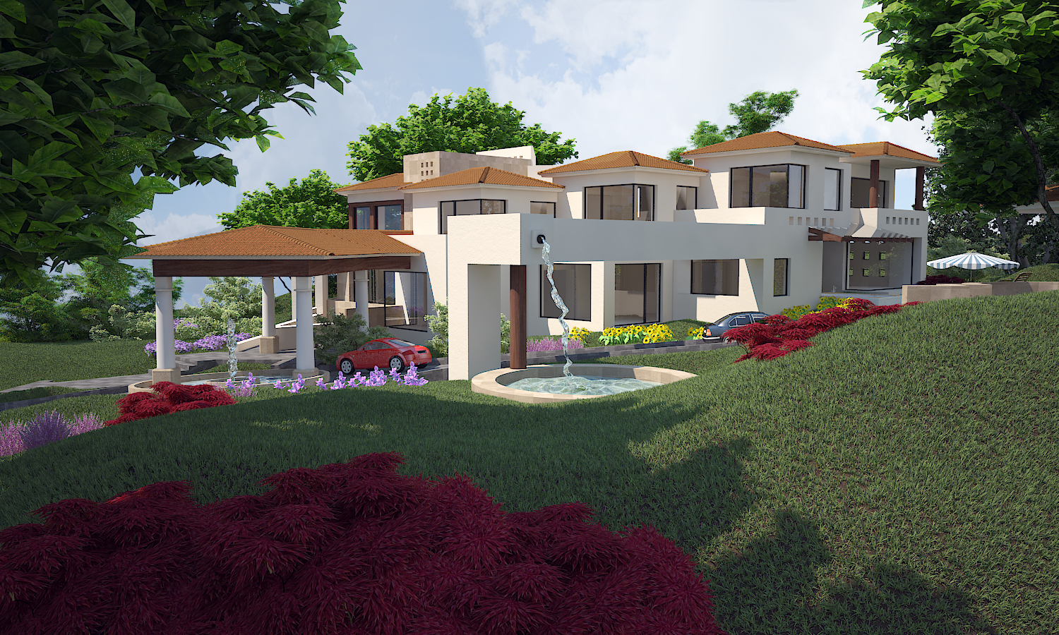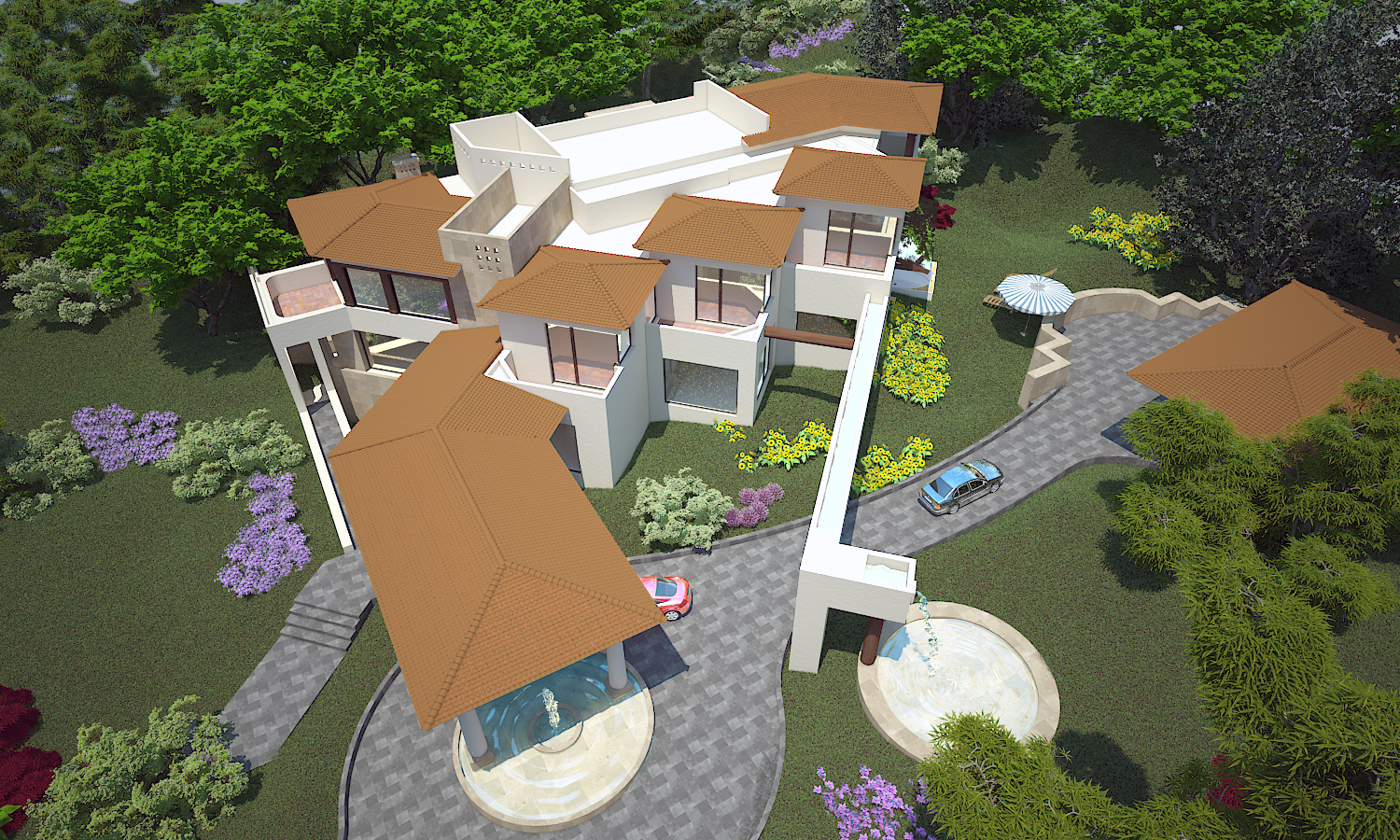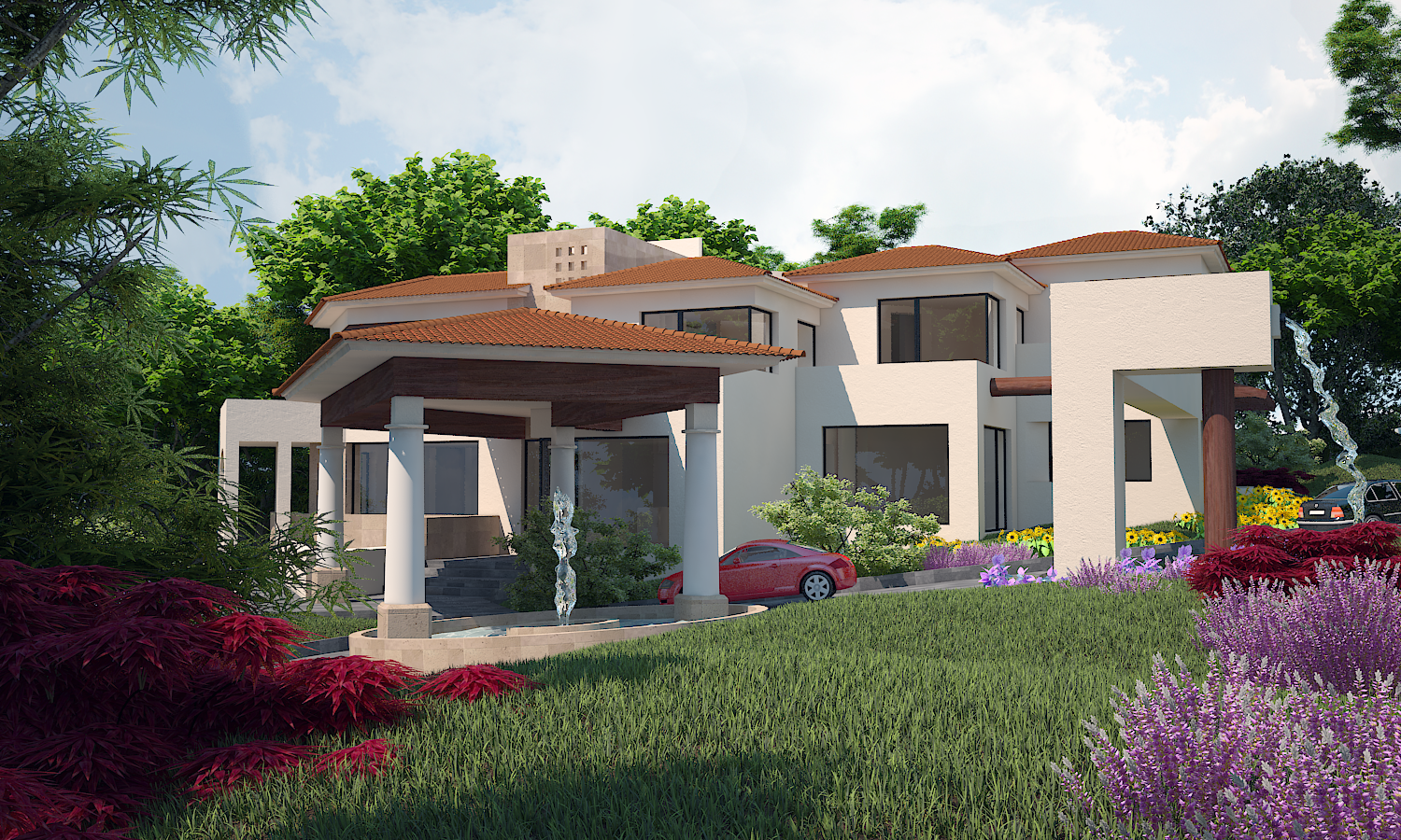 La casa tiene un programa de 5 habitaciones, sala de t.v., salón de juegos, gimnasio con sauna, recepción, oficina, sala de juntas, piano- bar, amplia estancia y comedor, cocina y desayunador, 3 talleres, despensas, lavandería y cuartos de servicio. El exterior la casa está rodeada de un extenso jardín en el cual se encuentra el área de estacionamiento para 4 autos, pórtico de acceso y área de asador con jacuzzi y bar.