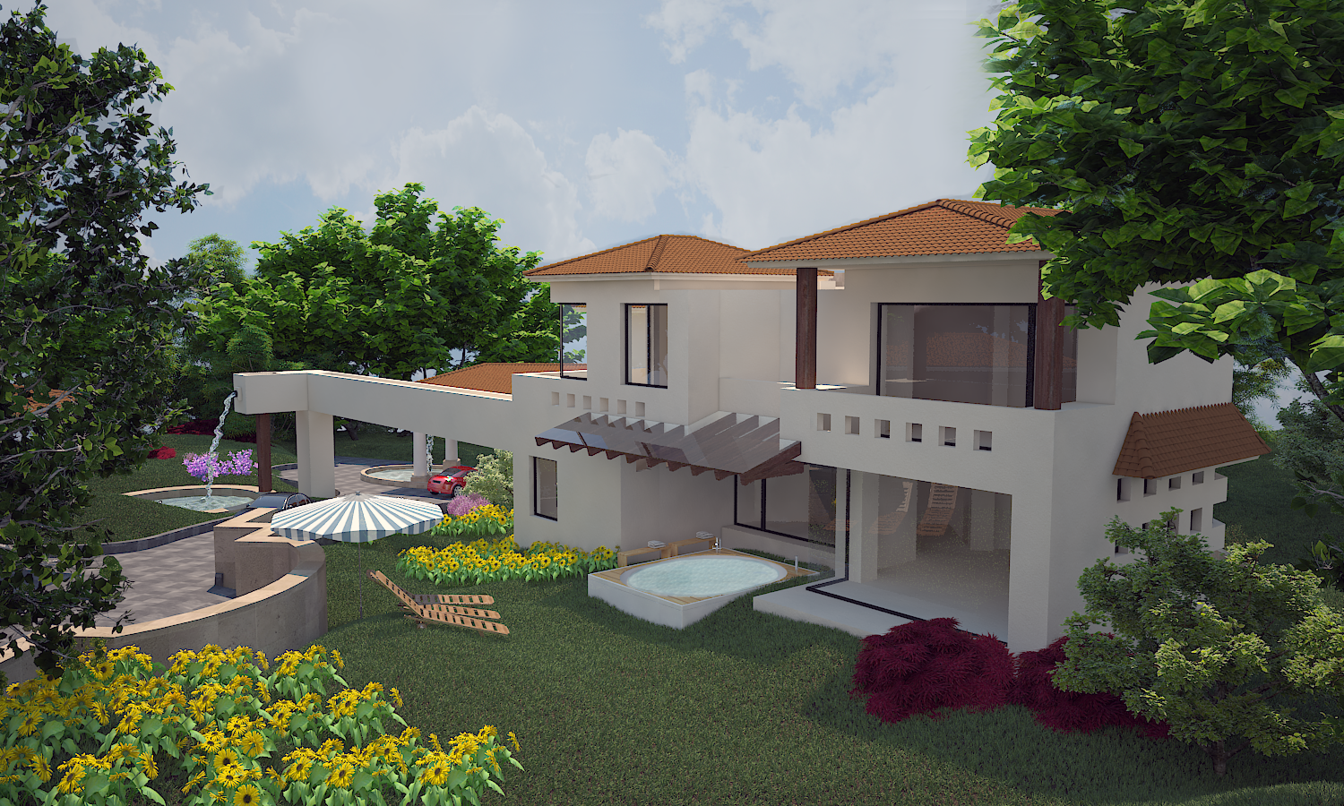 Los materiales en el exterior son aplanados de cemento en color blanco para contrastar con la naturaleza, tejas de barro y amplias ventanas de cristal templado.