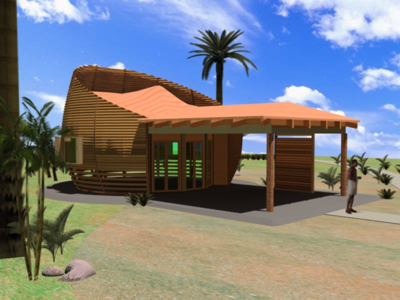 La vivienda está hecha de madera de Banak, con muros perimetrales curvos y altos son en forma de persiana con el objetivo de lograr la ventilación de manera natural como lo indica el esquema de ventilación. Los muros permiten el paso del aire y mantienen fresco el interior y cuando el aire entre a la cabaña, el aire caliente será succionado por la chimenea ubicada en la parte superior de la losa.
