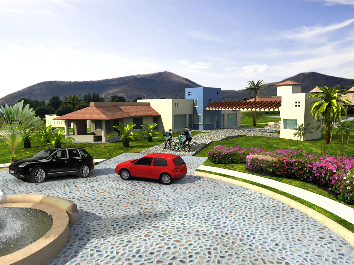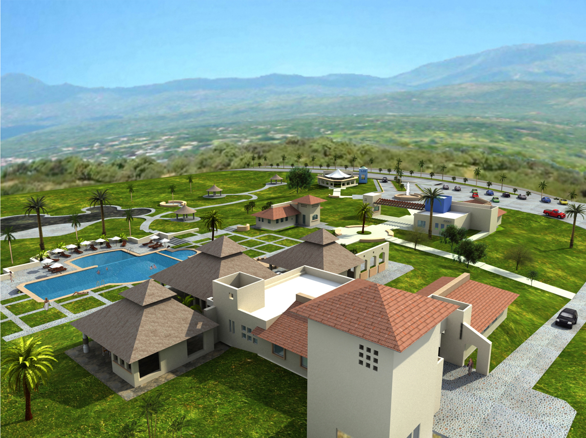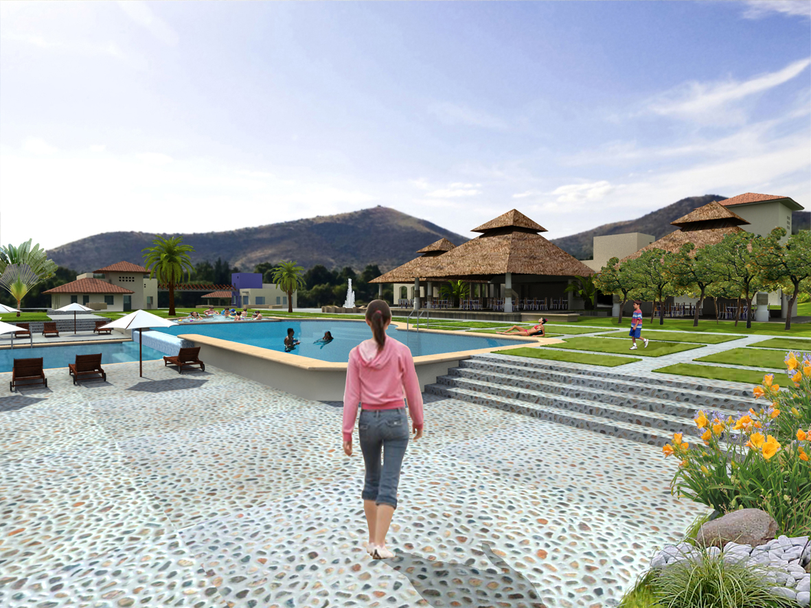 El programa incluye 1750.00 m² un pórtico de acceso y control, oficina de administración y venta de terrenos, dos amplios restaurantes, bar, baños vestidores, tres amplias albercas, áreas de asoleaderos, pista para correr, capilla al aire libre, área de campamento, palapas asadores, cuatro canchas de tenis, una de basketball, una voleibol, una chancha de futbol infantil, área de fogatas, área de juegos infantiles, áreas de servicio y estacionamiento. Resuelto en un terreno de 4.7 hectáreas.